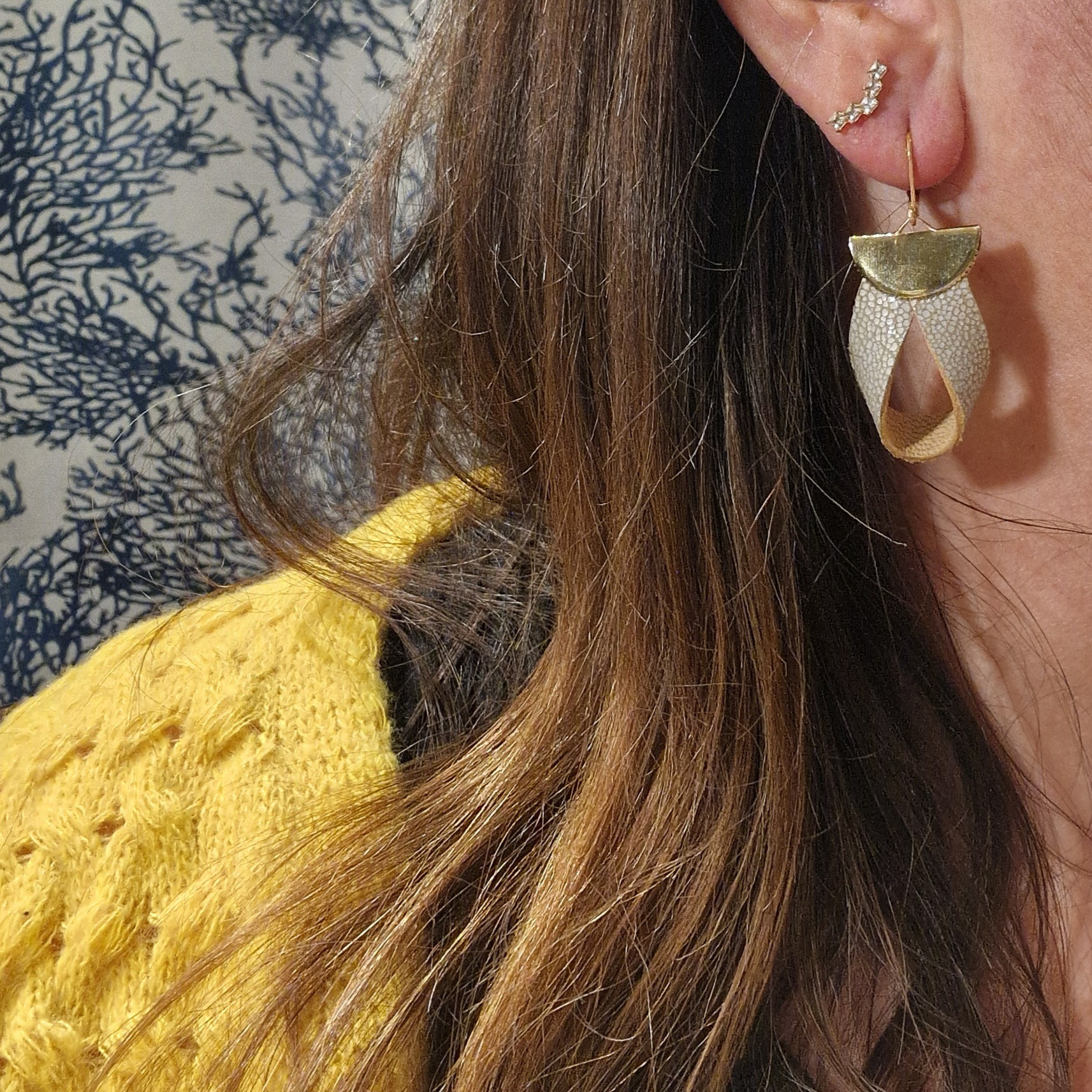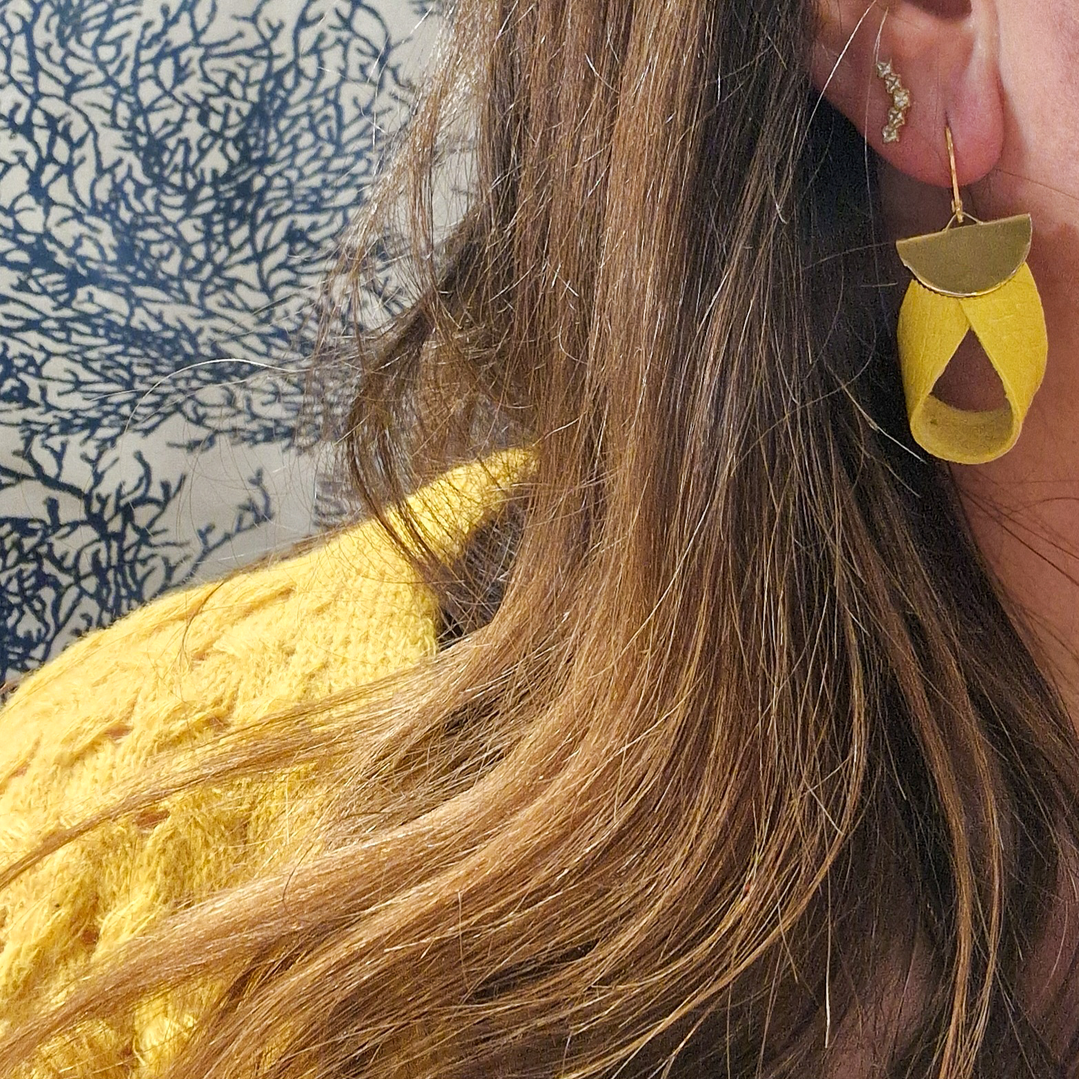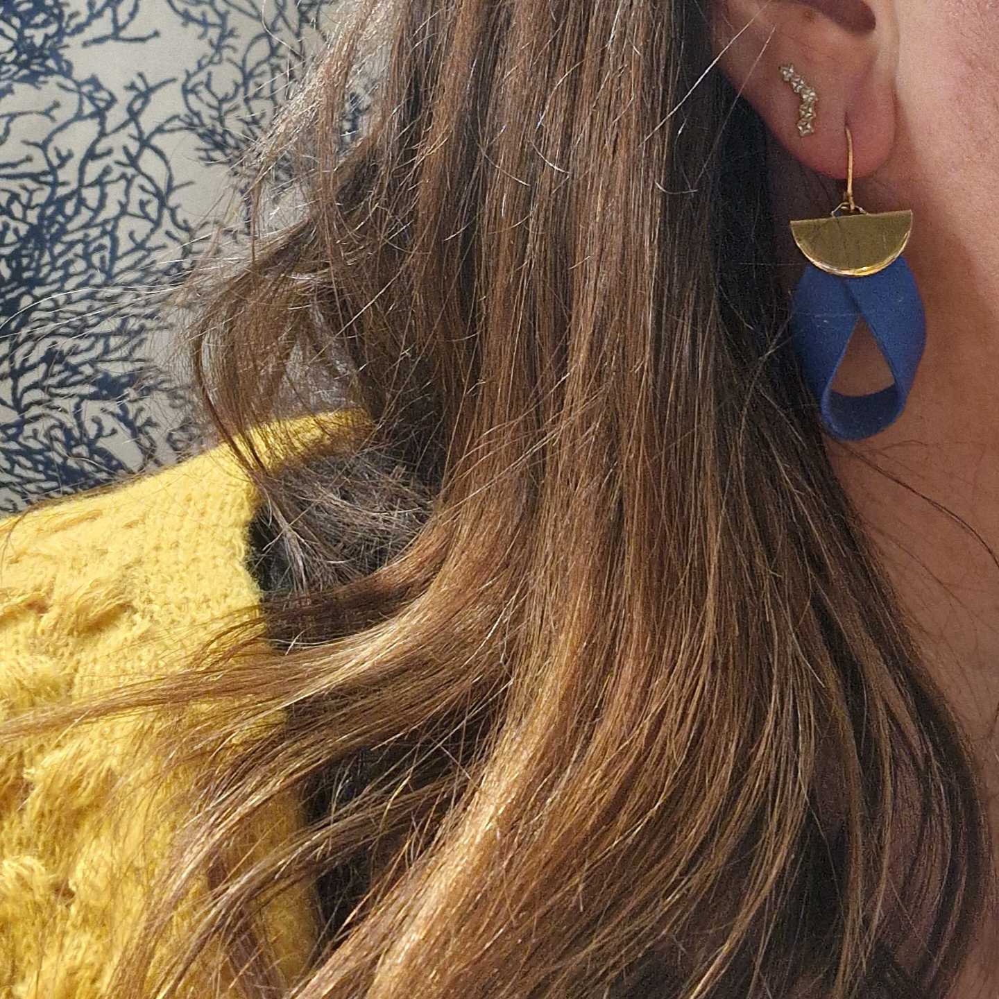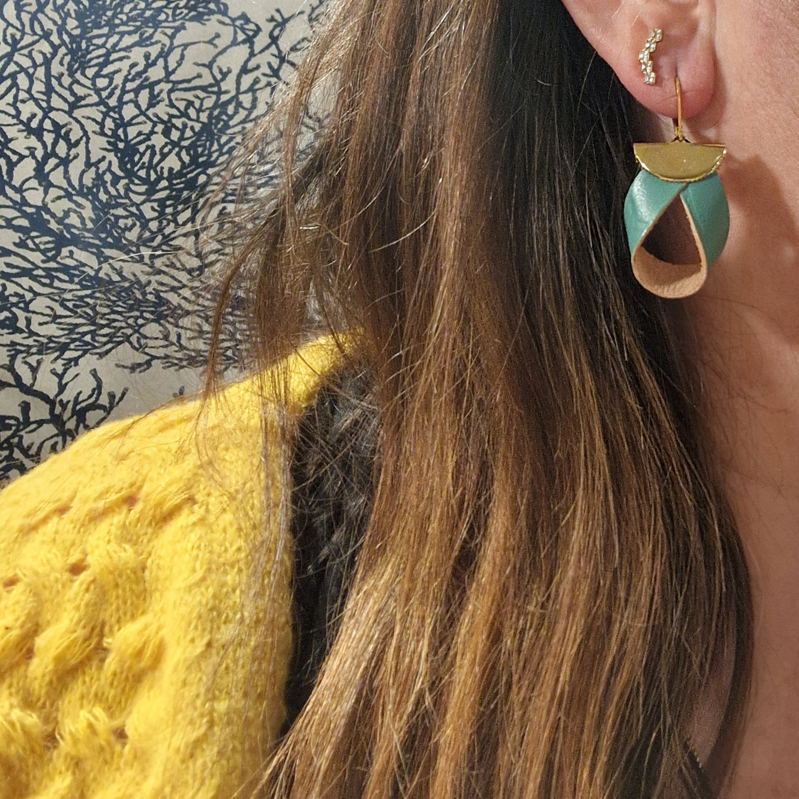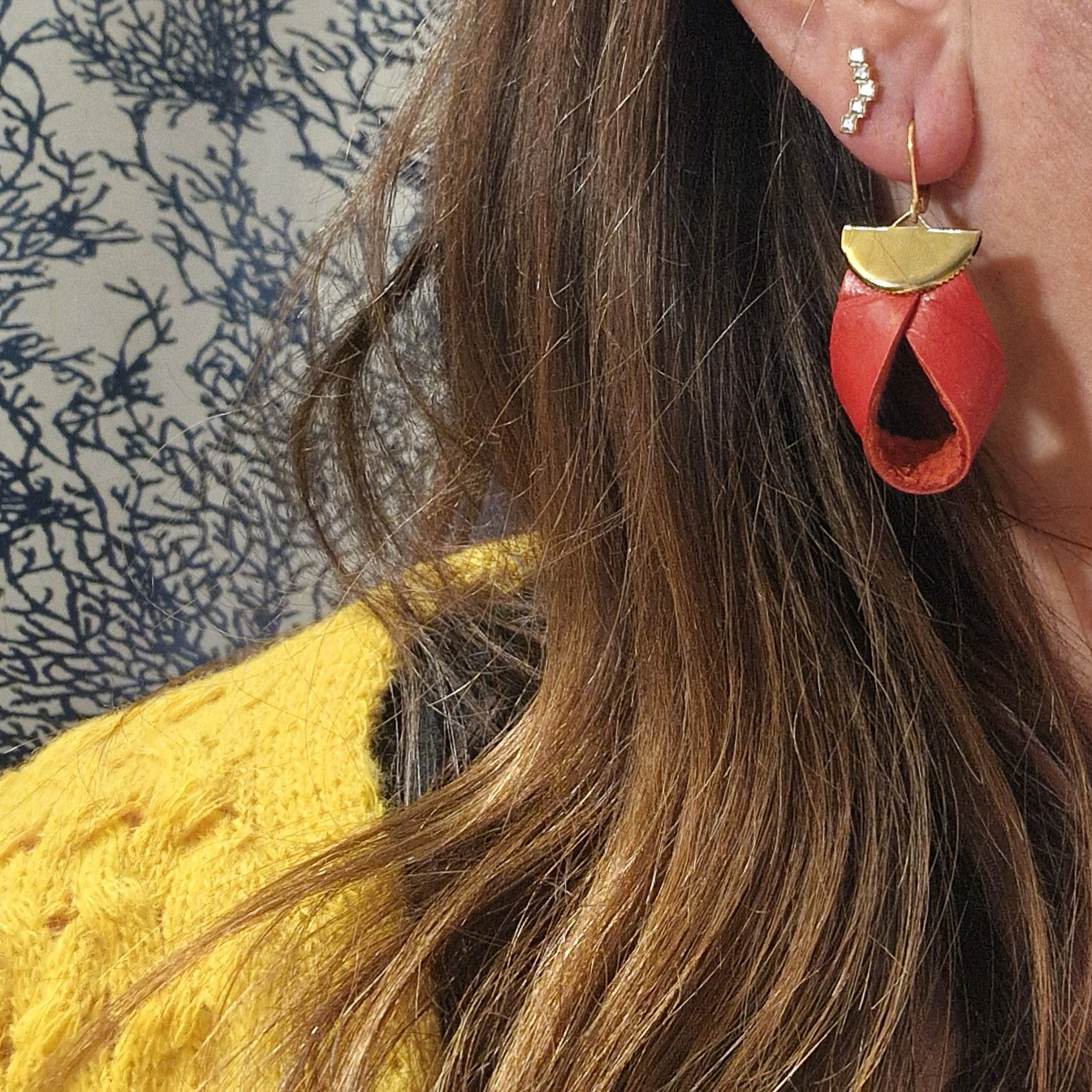 Chaque boucle est composée d’une dormeuse de 1,5 cm et d’une boucle en cuir de 2cm x 5cm.