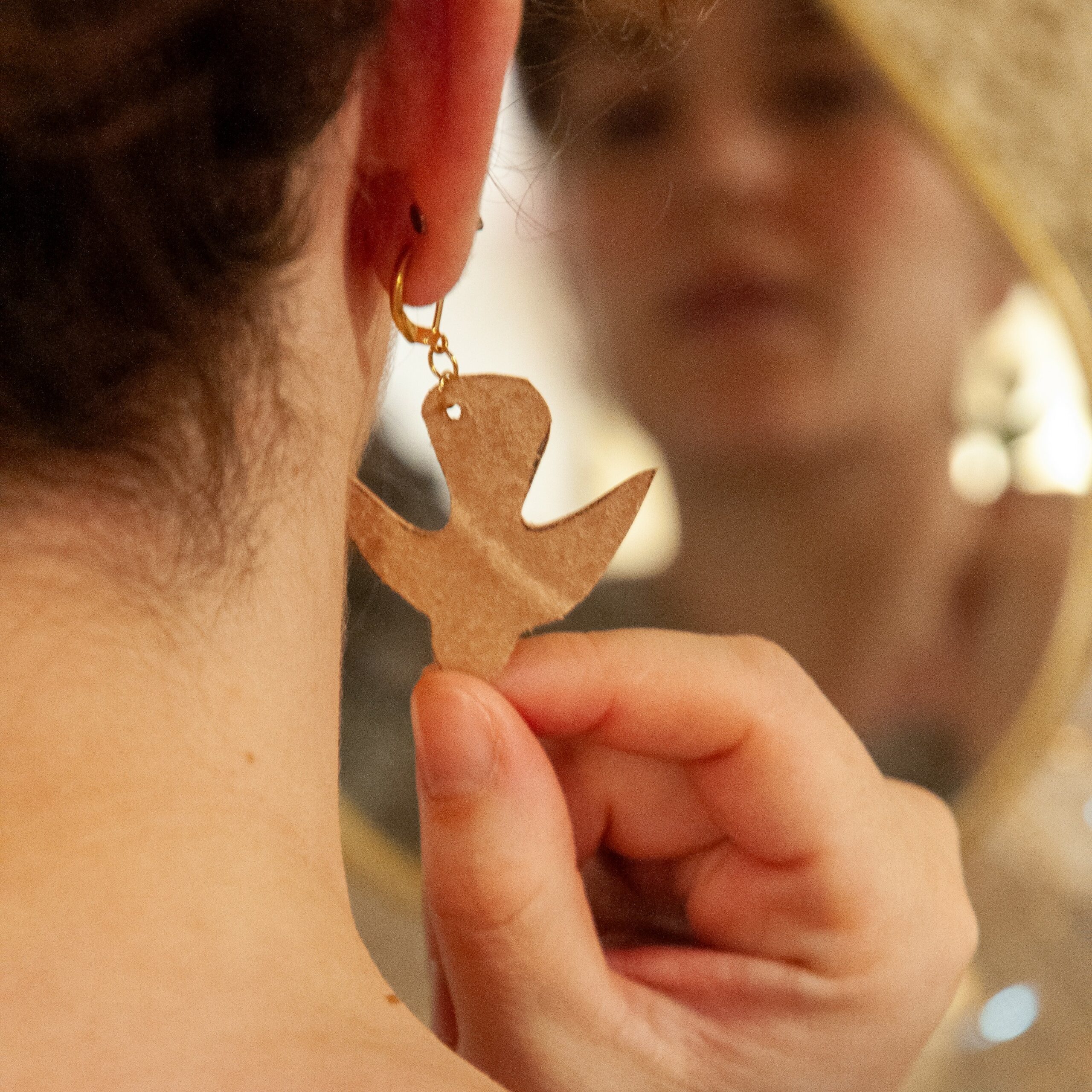 Chaque boucle est composée d’une dormeuse de 1,5 cm ou d’une créole de 4,5cm. Ajoutez à cela une feuille en cuir de 2,5cmx4,5cm et une colombe en cuir de 4cmx4,5cm.