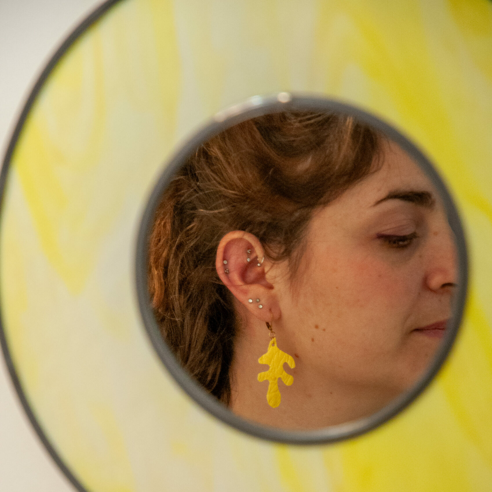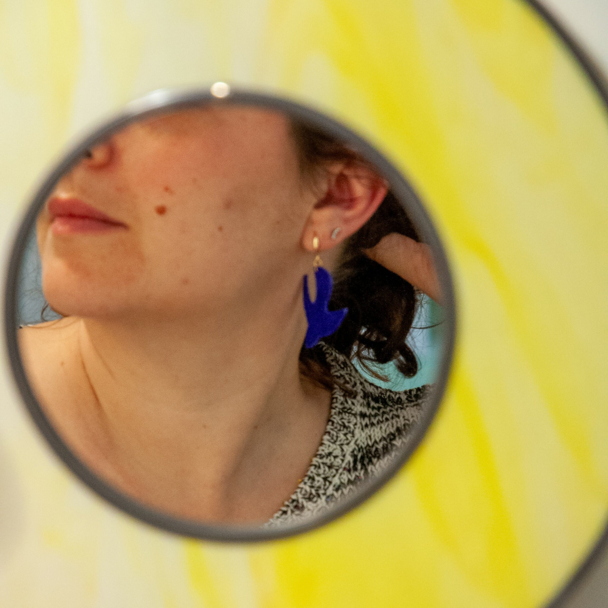 Ces boucles d’oreilles bicolores se marient très bien avec des looks asymétriques. J’aime particulièrement les porter avec des tenues rose saumon ou violettes pour faire ressortir le bleu de l’hirondelle et le rose de la feuille. Sinon, un t-shirt blanc et une veste jaune sont des alliés de choix pour les mettre en valeur.