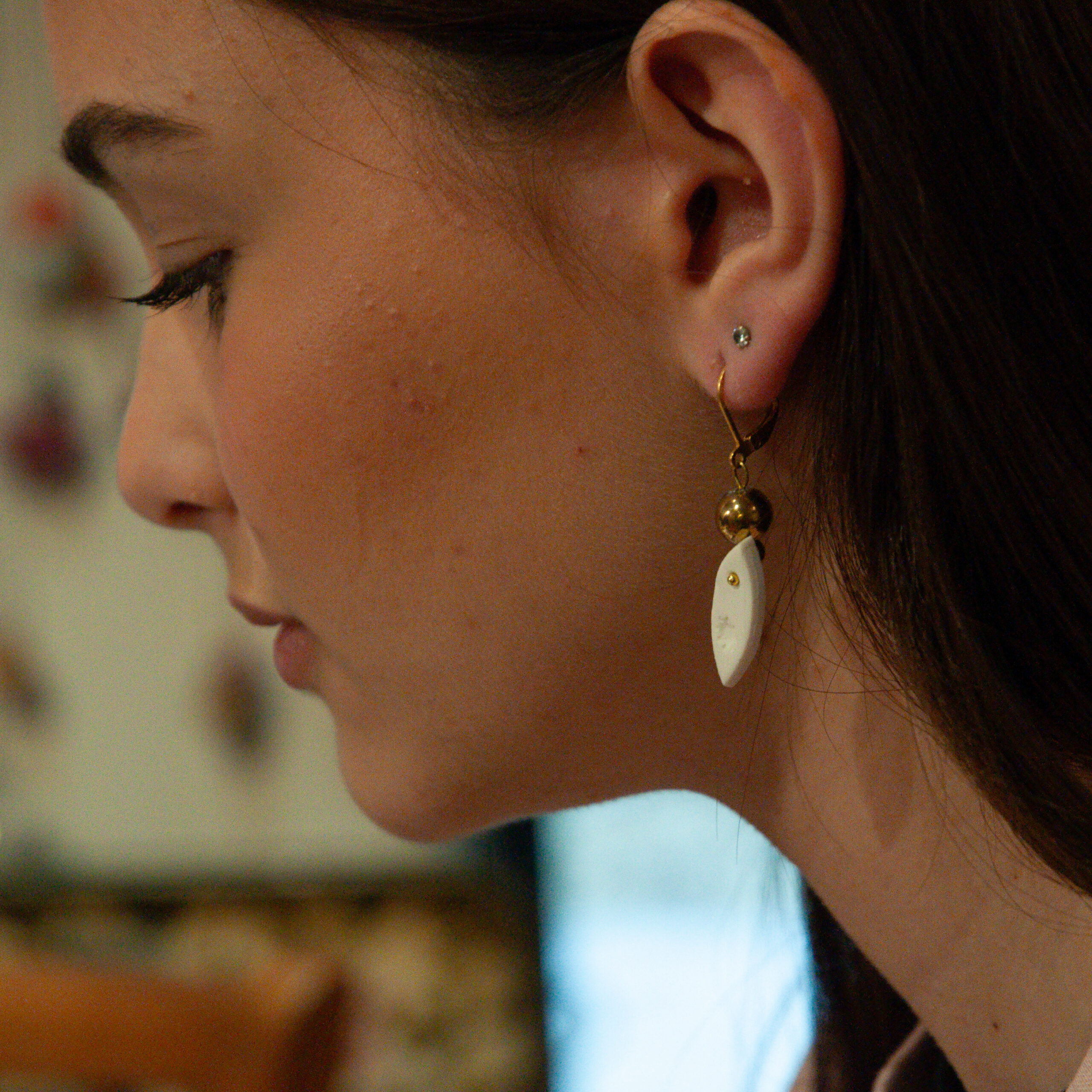 Intemporelles, elles ajoutent une touche de poésie à vos journées. Le blanc porcelaine est une couleur qui convient à tout le monde, qu’importe notre couleur de cheveux ou de peau. Ce sont des boucles d’oreilles élégantes, intemporelles et lumineuses.