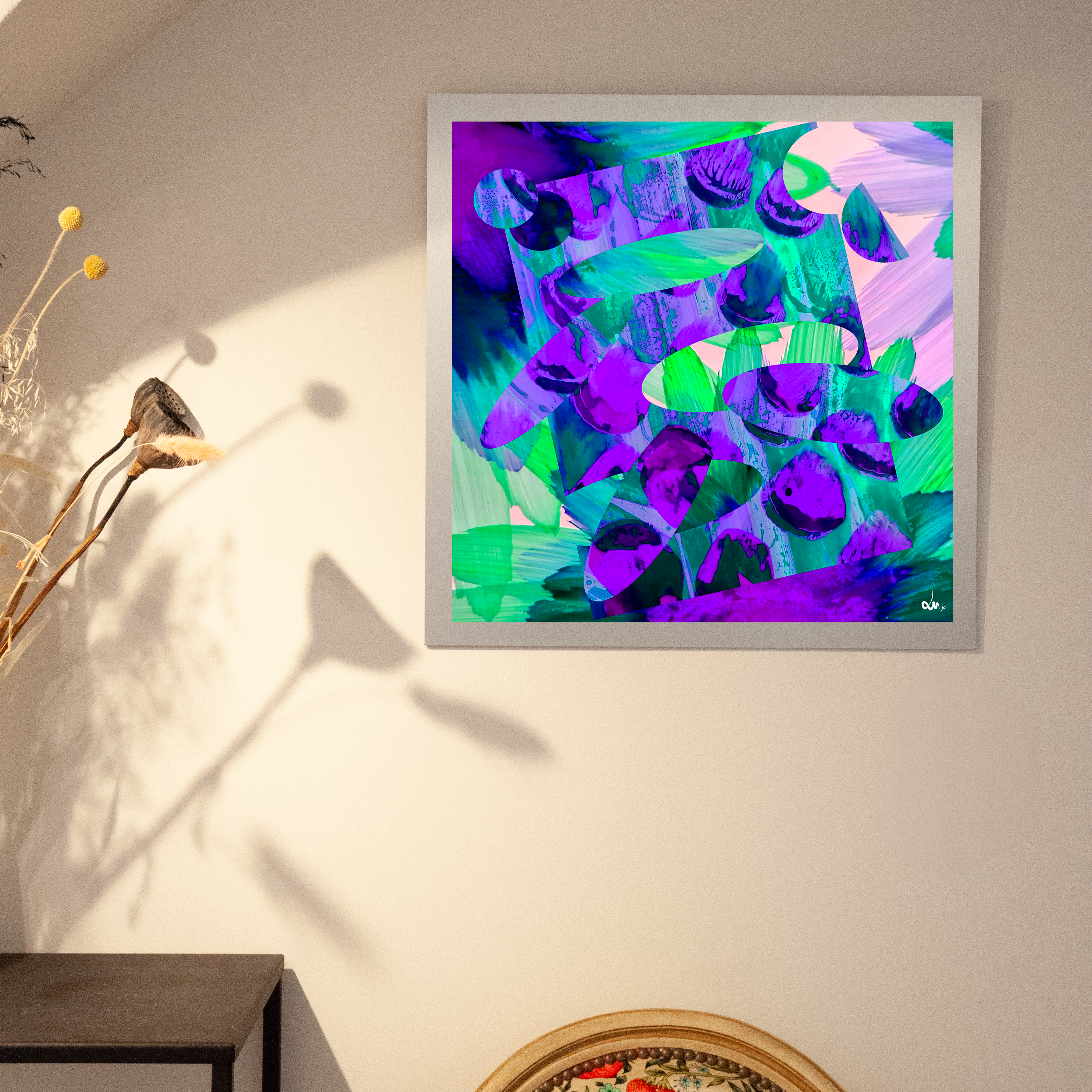 Le dibond est en aluminium léger, il résiste à l’humidité et à la lumière et peut très bien être installé en extérieur. Je vous propose le format 60cm x 60cm.
